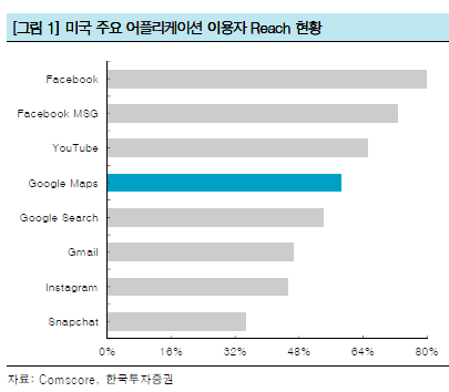 Comscore에 따르면 10억명 이상의 MAU(Monthly Active User)를 보유한 Google Map 어플의 Reach(특정 기간 어플에 최소 1회 이상 노출된 이용자의비율)는 58.4%로 Google Search의 54.1%를 상회할 만큼 빈번하게 사용된다. 국내 또한 스마트폰 이용자의 75% 이상이 모바일 지도 서비스를 사용하고 있다. 실시간 길 안내와 3D 실내 지도 등의 추가로 관련 기술이 빠르게 개선됨에 따라 지도 어플 사용은 지속 증가할 것으로 예상한다.