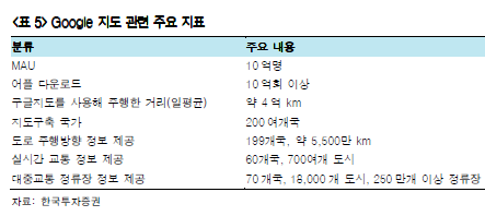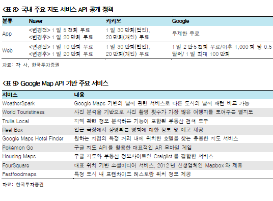 카카오도 웹과 모바일 모두 하루 기준 사용량이 30만건 미만인 경우에는 무료로 API를 공개하는 정책을 발표했다. 김 연구원은 "지도 API 공개 확대는 단기적으로는 수익에 부정적이지만 Google 사례에서 보듯이 트래픽 증가와 생태계 내 위치 강화 등의 수혜를 누릴 것"이라고 분석했다.