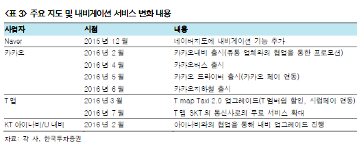 특정 이용자에 개인화된 광고인 타겟팅 광고의 중요성이 커지면서 이용자의 위치 파악에 필수적인 지도 어플에 대한 관심이 확대될 전망이다. 이를 증명하듯 Naver와 카카오는 시장 내 우위 선점을 위해 공격적으로 신규 서비스를 출시하고 있다. 카카오는 ‘카카오내비’를 비롯해 버스와 지하철 등의 서비스를 출시해 교통 버티컬 앱 생태계를 구축했다.
