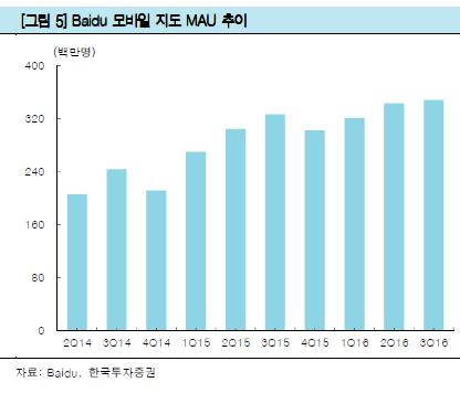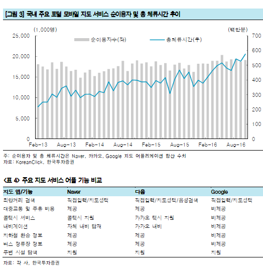 5일 한국투자증권은 "모바일 지도는 SNS, 검색과 더불어 국내 스마트폰 이용자의 75% 이상이 사용하는 주요 서비스로 이용자 데이터를 수집하기에 용이하다"고 진단했다. 모바일 광고의 다양화로 지도를 활용한 신규 광고 상품이 출시되면서 시장 선점을 위한 글로벌 업체들의 투자가 활발해지고 있는 것도 이와 무관치않다는 관측이다.
