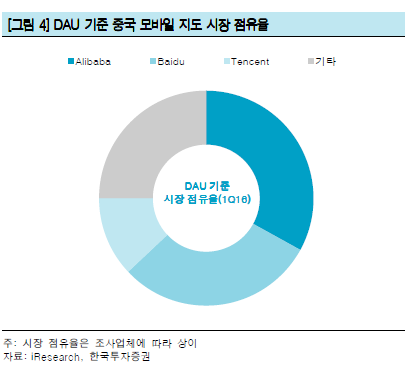 Alibaba는 2014년 AutoNavi를 인수해 Baidu와의 격차를 줄이는 한편 E-commerce 사업에도 적극 활용할 계획이다. Tencent 역시 2014년 NavInfo에 11.7억위안을 투자했으며 지도 시장 내 점유율 확대와 위치 기반 광고 사업 진출을 계획 중이다.