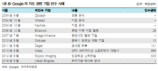 글로벌 선두 업체를 중심으로 지도 서비스에 대한 공격적인 투자가 집행되고 있다.Google은 2005년과 2007년 디지털 3D 지도인 ‘Google Earth’와 ‘Street View’를 공개했다. 2013년에는 소셜 기반 네비게이션 어플 업체인 ‘Waze’를 인수하며 네비게이션 시장에도 진출했다. Google은 Waze 이용자를 통해 확보한 정보를 이용해 경쟁사 대비 빠르게 업데이트함으로써 시장 내 영향력을 키우고 있다. 한편 차량 공유 업체인 Uber는 지난 8월 Google Maps에 대한 의존도를 축소하고 자율주행차 사업의 기반을 마련하기 위해 지도에 5억달러 이상을 투자하기로 결정했다.