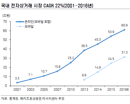 2001년~2016년 국내 전자상거래 시장의 CAGR은 22%, 2001년 대비 16배 성장세를 보이고 있다.