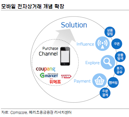 네이버쇼핑의 경우 2015년 6월 네이버페이를 출시하며 온라인/모바일 쇼핑 플랫폼으로 본격 성장하고 있다. 2015년 모바일쇼핑 1위 사업자였던 쿠팡의 연간 거래액이 3조원이었음을 감앆하면 2016년을 기점으로 네이버쇼핑은 모바일 1위 쇼핑플랫폼으로 성장할 것으로 예상된다.