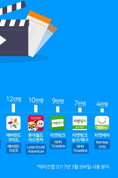 한국의 영화, 공연, 전시, 놀이동산 관련 앱 1위는 어디일까. 30일 와이즈앱에 따르면, 영화관 앱으로 1위는 ‘CGV’로 월 227만 명, 2위는 ‘롯데시네마 모바일앱’ 114만 명, 3위는 ‘메가박스’ 84만 명이었다.4위와 5위는 티켓 구매 앱인 ‘인터파크 티켓’(38만), ‘캔고루’(15만)로 집계됐다. 6위와 7위는 놀이동산 앱인 ‘에버랜드 가이드’(12만)와 ‘롯데월드 어드벤처’(10만)였고, 그 뒤를 ‘티켓링크’(9만), ‘티켓링크 농구/배구’(7만), ‘티켓베이’(4만)가 차지했다. [서울와이어 김지원기자 jiwon@seoulwire.com]