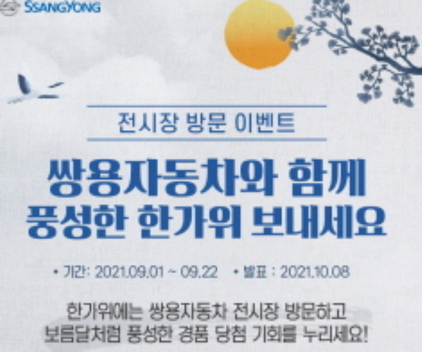 쌍용차도 9월 출고 고객에 귀성비 지원 등 풍성한 구매 혜택을 준비했다. 쌍용차가 준비한 ‘한가위 감사 페스티벌’에는 차량 구매 시 ▲귀성비 지원 ▲무이자 할부 ▲초저리 할부 등 고객 맞춤형 혜택이 담겼다.