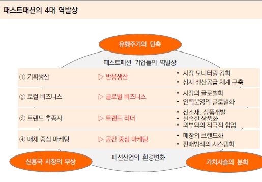 SPA 브랜드의 성공요인은 최소한의 재고, 트랜드에 맞춘 빠른 생산, 기획에서부터 출시까지의 리드타임 단축에 있다. IT 미디어가 발전하면서 유행의 전파속도와 지속시간이 크게 단축되고 있고, 신흥국을 중심으로 구매력을 갖춘 도시 중산층이 빠르게 증가함에 따라 이들의 의류소비가 크게 증가하고 있다. 따라서 의류업체들도 기존의 생산방식과는 다른 생산방식의 적용이 중요시되고 있는 상황이다.