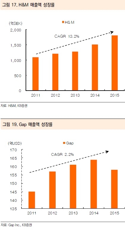 그러나 무엇보다도 SPA브랜드들의 성장률 둔화는 1) 장기화되는 경기 불황, 2) 새로운 트랜드인 애슬레저 시장의 고성장세가 주된 원인인 것으로 판단된다.