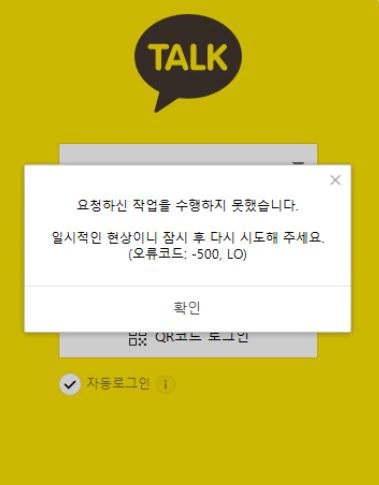PC용 카카오톡 이용자의 일부는 자동 로그아웃이 됐고, 이후 로그인이 되지 않는 현상이 지속되고 있다. 현재 로그인을 시도하면 “요청하신 작업을 수행하지 못했습니다. 일시적인 현상이니 잠시 후 다시 시도해 주세요”라는 문구가 뜬다.