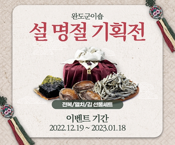 [서울와이어 광주ㆍ호남본부 김도형 기자] 완도군(군수 신우철)은 다가오는 설 명절을 맞아 군 대표 온라인 쇼핑몰인 ‘완도군이숍’에서 설 명절 기획전을 준비했다.