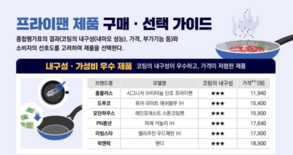 그 아래 단계인 ‘양호’를 받은 제품은 롯데마트, 키친아트, 해피콜의 제품이었다. 세신퀸센스와 테팔의 제품은 마지막 단계인 ‘보통’을 받았다.