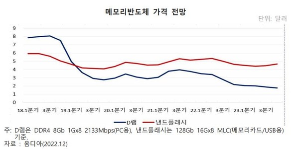 구체적 전망을 한국 수출입은행 자료로 살펴보자. 올해 메모리반도체 시장은 가파른 수요감소, 가격하락, 높은 재고수준 등으로 전년 대비 17% 역성장할 것으로 보인다. 상반기는 수요기업의 반도체 재고소진으로 메모리반도체 수요가 둔화될 전망이다. 중반부터 반도체 구매가 회복되면서 수요 개선이 기대될 것으로 보인다. D램 가격은 4분기까지 하락하나 낸드플래시 가격은 3분기 반등이 예상된다.