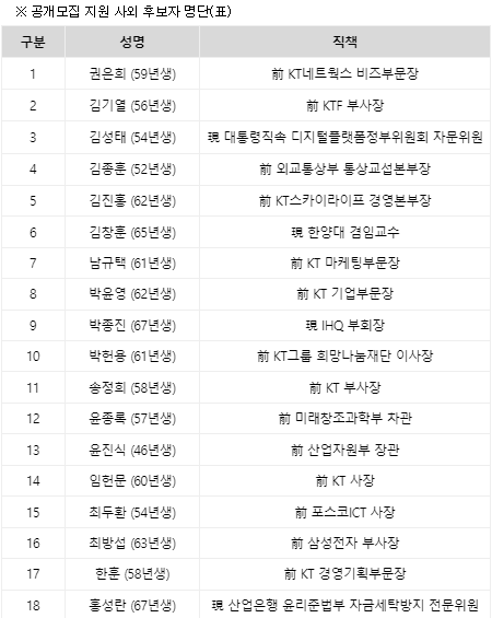 아래는 KT가 공개한 대표이사 사외 후보자 명단이다.