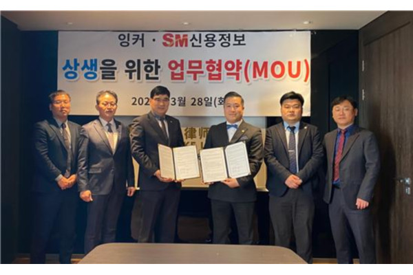 업무협약식은 지난 28일 잉커 로펌 사무실에서 진행됐고 SM신용정보의 공문용 영업총괄본부장과 정현우 영업본부장, 잉커 로펌의 김성익 CGO, 김용 부대표 변호사 등이 참석했다.