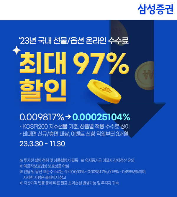 [서울와이어 서영백 기자] 삼성증권이 온라인 채널을 통한 국내 선물, 옵션 거래 고객을 대상으로 거래수수료를 최대 97% 할인한다.