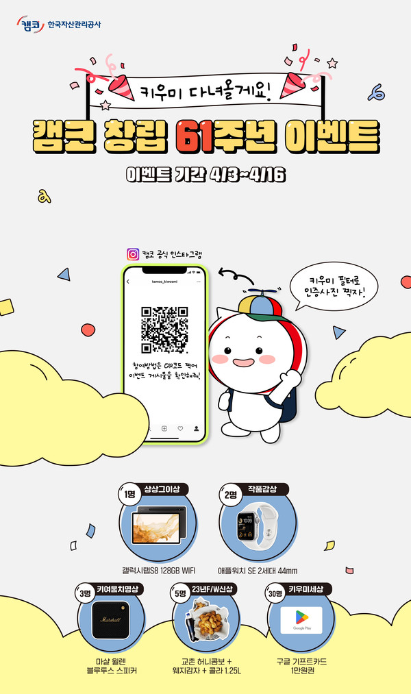 차상휘 캠코 홍보실장은 “국민과 희노애락을 함께하며 성장해온 캠코가 어느덧 창립 61주년을 맞았다”며 “국민들에게 감사한 마음을 전하고자 준비한 이벤트인 만큼 많은 참여와 관심을 부탁드린다”고 말했다.