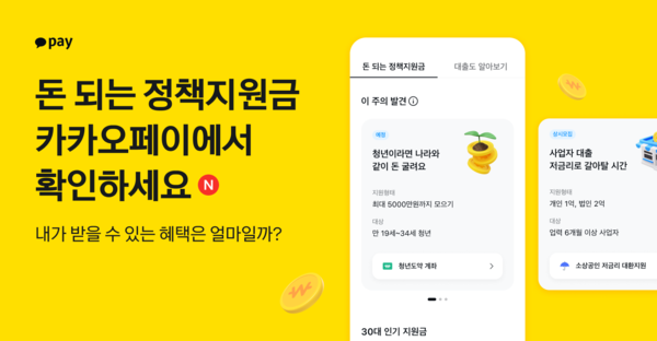 [서울와이어 서영백 기자] 카카오페이는 나라에서 제공하는 정책지원금을 쉽게 확인하고 적합한 정책지원금을 추천해 주는 '돈 되는 정책지원금' 서비스를 시작한다고 5일 밝혔다.