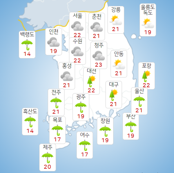 예상 낮 최고기온은 ▲서울 22도 ▲인천 19도 ▲춘천 21도 ▲강릉 21도 ▲대전 22도 ▲대구 21도 ▲전주 21도 ▲광주 19도 ▲부산 19도 ▲제주 20도 등이다.