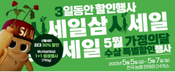 [서울와이어 이재형 기자] 한국인삼협회가 농협경제지주, 인삼자조금관리위원회와 함께 오는 5~7일 3일간 ‘2023 5월 가정의 달 수삼 최대 반값 할인행사’를 개최한다고 3일 밝혔다.