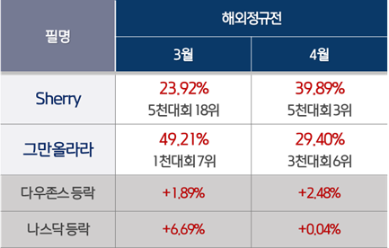 해외주식 정규전에도 2명의 투자자가 2개월 연속 상위권에 이름을 올렸다. 3월 수익률 23.92%로 5000대회 18위를 기록했던 ‘Sherry’는 4월에는 39.89%로 3위를 기록했다. 4월 대회기간 미국증시는 다우존스 기준 2.48%, 나스닥은 기준 0.04% 상승했다.