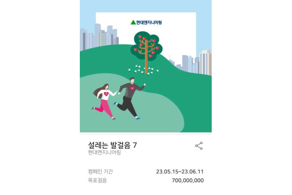 현대엔지니어링은 ‘설레는 발걸음 캠페인 7’을 다음 달 11일까지 진행하며 임직원 뿐만 아니라 일반 시민까지 참여할 수 있는 오픈형 캠페인으로 진행한다. 이번 캠페인의 목표 걸음 수는 7억 걸음이다.