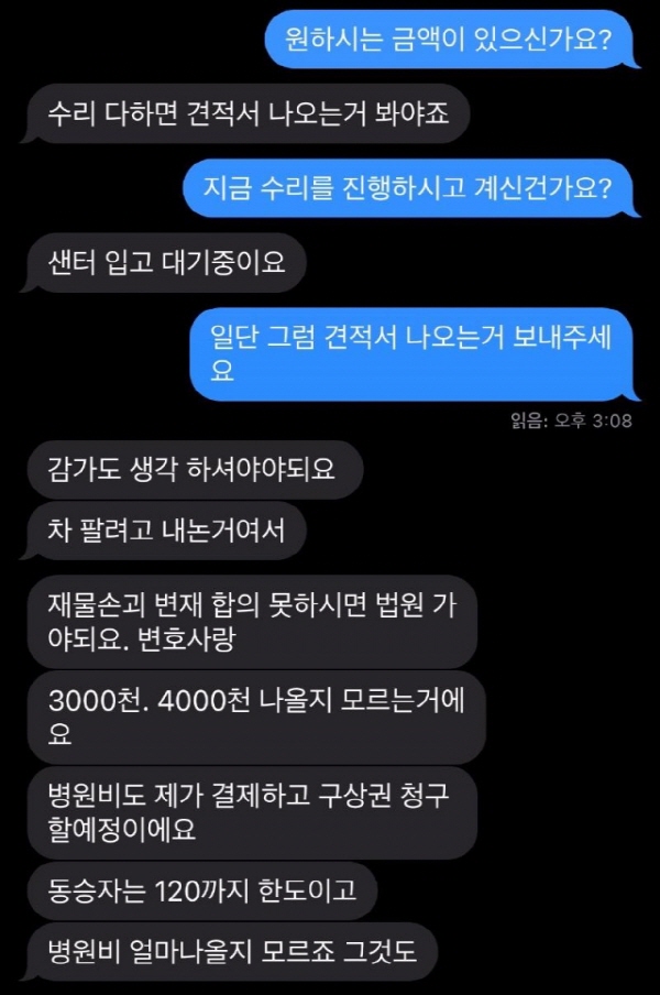 차주는 또 “병원비도 제가 결제하고 구상권 청구하겠다”며 “동승자 한도는 120만원까지고, 병원비는 얼마 나올지 모르겠다”고 덧붙였다.