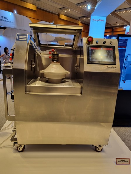 써모피셔 관계자는 “바이오의약품을 만들 때 세포는 버리고 액체는 수거하는 과정을 거쳐야 하는데, 이 원심분리기를 이용하면 세포가 액체보다 무거워 세포는 쌓이고 용액은 빠지면서 타깃 용액을 분리할 수 있다”고 설명했다.