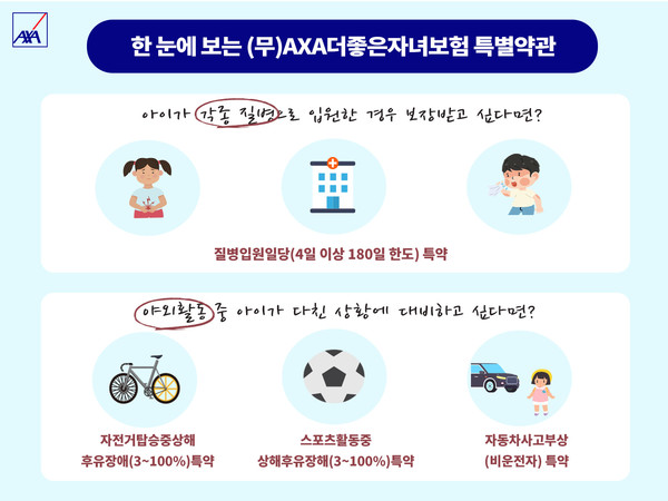 AXA손해보험 관계자는 ″(무)AXA더좋은자녀보험은 일상 곳곳에 도사리고 있는 다양한 위험상황으로부터 소중한 자녀를 보호할 수 있도록 보장체계를 마련한 상품이다″며 ″가정에서도 면역력이 떨어진 자녀의 건강관리 및 사고 대비 안전수칙을 준수함과 동시에, 피해 발생 시 폭넓게 보장받을 수 있는 보험 상품을 통해 걱정 없는 일상을 보내시길 바란다″고 말했다.