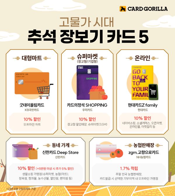 7일 국내 신용카드 플랫폼 카드고릴라는 고물가시대 '추석 장보기 카드 5종'을 공개했다.