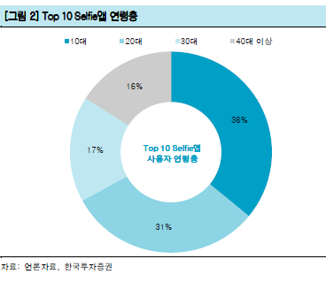 한국투자증권 김성은 연구원은 24일 "Selfie App 이용자들의 67%는 향후 주요 소비층으로 자리잡을 10대와 20대이기 때문에 인터넷 기업들의 공격적인 투자가 지속적으로 이루어질 것"이라고 진단했다.