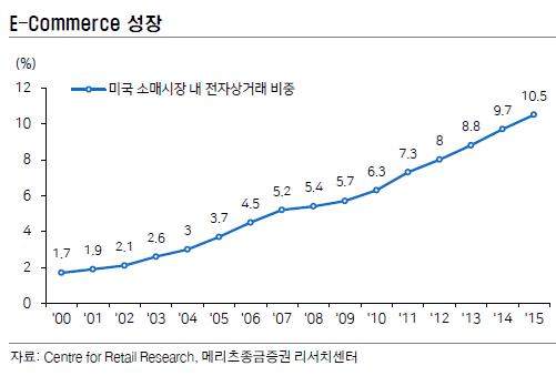 11일 메리츠종금증권에 따르면, 2015년 미국 소매시장 내 온라인 채널의 비중은 10.5%. 거래금액은 3,400억달러 규모(2000년도 1.7%)인 것으로 나타났다.