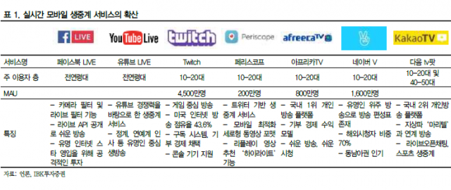 최근 글로벌 인터넷 기업들을 중심으로 동영상 생중계 서비스가 확산되고 있어 개인방송 시장의 고성장이 예상된다. 트위터는 페리스코프 를 제 2의 성장 동력으로 점찍었으며 페이스북, 유튜브, 네이버도 올해부터 본격적인 라이브 영상 서비스를 도입했다. 국내 독보적 점유율을 보유한 아프리카TV도 이러한 패러다임 변화에 따른 직접적인 수혜가 기대된다.