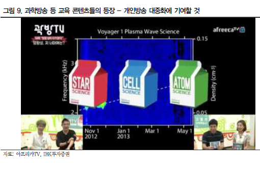 유익한 콘텐츠의 증가는 개인 방송의 대중화를 견인할 것으로 기대된다. 또한 다소 자극적인 방송에 대한 자정 노력을 통해 아프리카TV에 대한 인식 개선 작업도 꾸준히 진행될 것으로 예상한다. 지나친 노출이나 가학적인 콘텐츠들에 대한 자율적인 가이드라인 마련을 통해 논란의 여지가 점차 줄어들 것이다.