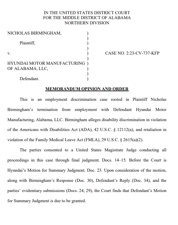 지난 6일(현지시간) 미국 앨라배마 중부 지방법원 북부 지원 켈리 피츠제럴드 패트(Kelly Fitzgerald Pate) 치안판사는 니콜라스 버밍엄(Nicholas Birmingham)이 현대차 앨라배마 법인을 상대로 제기한 고용 차별 소송을 반려하고 약식판결로 사건을 매듭지었다.