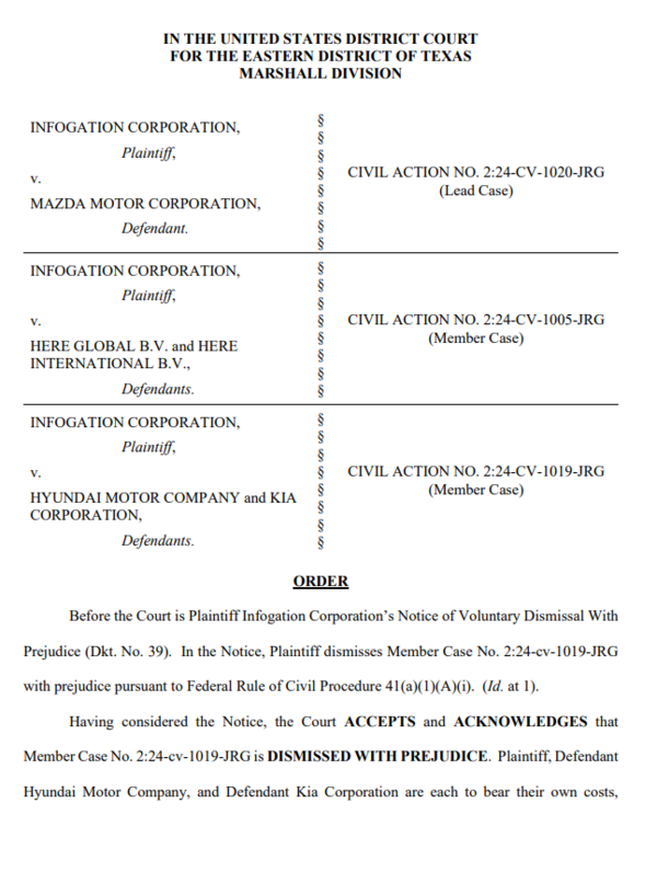 25일(현지시간) 텍사스주(州) 동부 연방지방법원 마샬지원(Marshal Division)에 따르면 로드니 길스트랩 판사는 인포게이션과 현대차·기아의 특허소송에 대해 소 취하 명령문을 판시하며 사건을 종결했다.