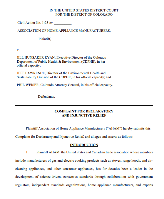 소장에서 AHAM은 “콜로라도 주 법률 HB25-1161이 강요하는 규칙들은 헌법에 정면으로 위배된다”며 “가스레인지의 건강 위험성을 경고하는 문구와 QR코드 부착을 의무화하고 이를 따르지 않으면 벌금, 집단소송, 손해배상 등 중대한 법적 책임을 지우는데, 이는 명백히 과도하다”고 주장했다.