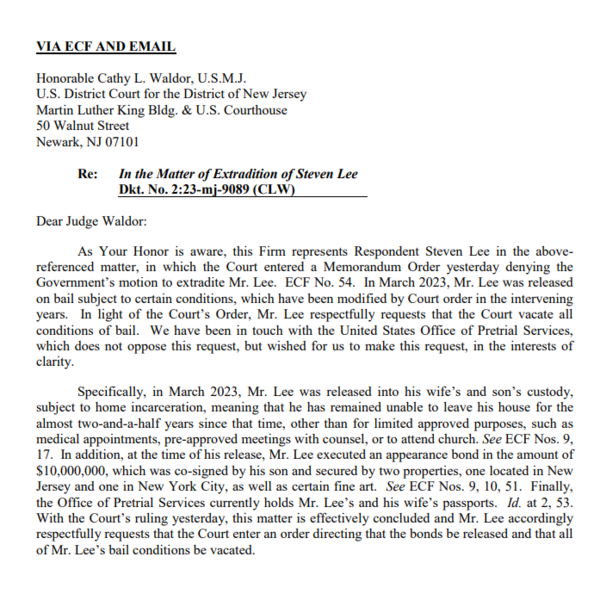 7일(현지시간) 미국 뉴저지주(州) 연방지방법원 제출 문건에 따르면 스티븐 리 측 변호인은 범죄인 인도 청구를 기각한 캐시 L. 월도(Cathy L. Waldor) 판사에게 “인도 기각 판결로 사건이 종결됐으므로 모든 보석 조건을 해제해 달라”고 요청했다.