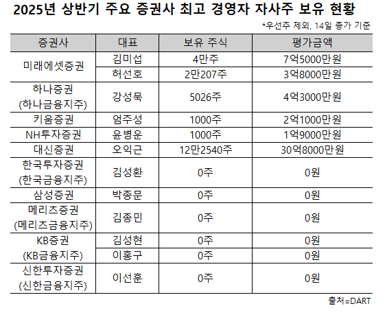 자사주 보유 규모 및 평가액이 가장 높은 CEO는 대신증권 오익근 대표로 보통주 12만2540주, 평가금액은 30억8000만원(14일 종가기준)에 달한다.