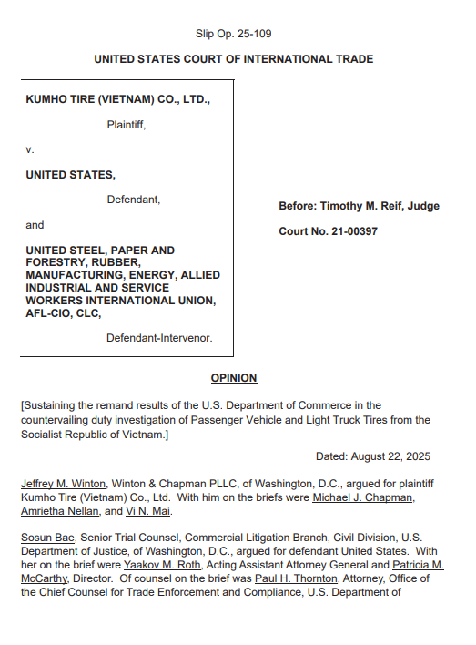 22일(현지시간) 미국 국제무역법원(CIT) 티모시 M. 레이프(Timothy M. Rief) 판사는 금호타이어 베트남 법인(이하 금호타이어)이 제기한 상계관세 계산 오류 주장을 기각하고 상무부의 결정을 유지했다. 레이프 판사는 “2019년도분 베트남산 승용차 및 경트럭용 타이어 보조금 조사에 대한 미국 상무부의 판단을 인용한다”고 말했다.