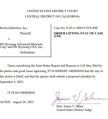 이날 코오롱과 HS효성은 요청서에 “USPTO 국장은 지난 8월 14일자로 피고 HS효성이 제출한 3건의 IPR 청구 전부에 대해 개시를 거부하는 결정을 내렸다”며 “IPR 청구가 본 사건을 정지시킨 근거였던 만큼, 이제 그 사유가 해소됐다”고 소송 재개 이유를 밝혔다.