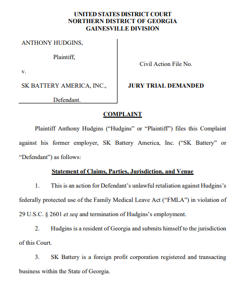 지난 3일(현지시간) 미국 조지아주(州) 북부 지방법원 게인즈빌 지원에 따르면 앤서니 허진스(Anthony Hudgins)는 SK온을 상대로 노동법 위반 소송을 제기했다.