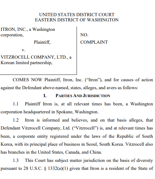 [서울와이어=천성윤 기자] 미국 계량기 업체 아이트론(Itron)이 자사의 전기 계량기에 탑재된 배터리가 예상수명에 크게 못 미쳐 조기 고장 났다며 한국 배터리 제조사 비츠로셀을 상대로 손해배상 소송을 제기했다. 아이트론은 피해 금액이 793만달러(약 110억원)에 이르며, 비츠로셀은 이를 보전하지 않고 있다고 주장했다.