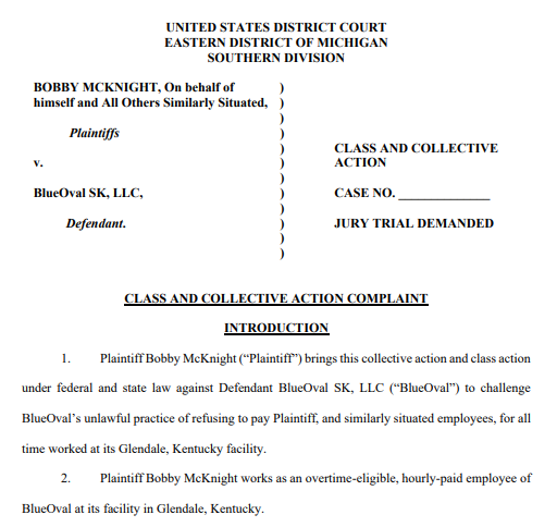 지난달 24일 미시간주 동부 지방법원 남부지원에 따르면 원고 바비 맥나이트(Bobby McKnight)는 블루오벌SK를 상대로 임금 미지급 집단소송을 제기했다. 그는 켄터키주 글렌데일에 위치한 블루오벌SK 공장에서 근무하는 근로자들이 정당한 임금을 받지 못했으며, 근무 시작 전후 필수 절차를 무급 처리했다고 강조했다.