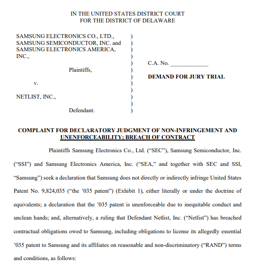지난 11일(현지시간) 미국 델라웨어주(州) 연방지방법원에 삼성전자, 삼성전자 아메리카, 삼성 반도체(Samsung Semiconductor, INC.)는 넷리스트를 상대로 ▲특허 무효 및 권리남용 ▲JEDEC(Joint Electron Device Engineering Council, 국제반도체표준협의기구) 표준특허 계약 위반을 주장하는 소송장을 제출했다. 미국 특허 9,824,035(이하 035)에 대한 삼성전자의 비침해 확인 판결도 함께 요청했다. 035 특허는 메모리 모듈 안에서 신호가 제때 잘 도착하도록 타이밍을 맞추는 기술이다.